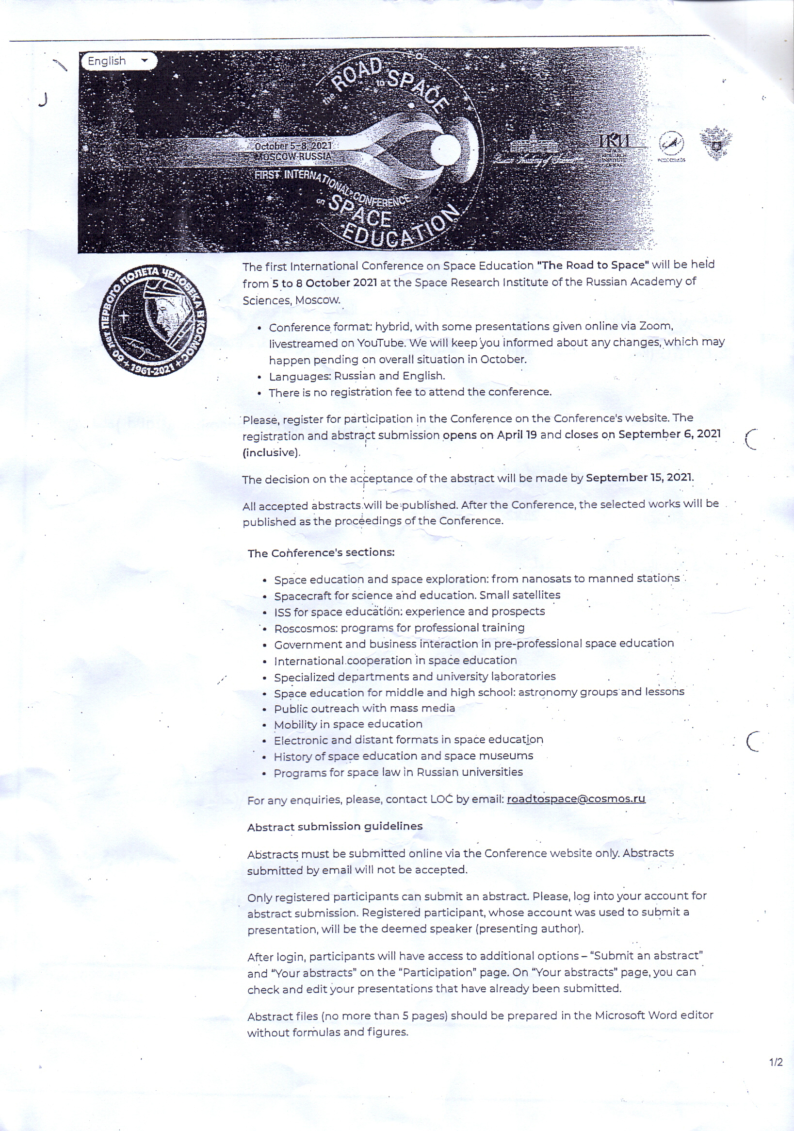 The General Administration for students’ welfare (Scientific and technology activity administration) announces the participation in the first international conference “the road to space” which will be held from 5th to 8th October 2021, it will be organized by the Russian Space Agency”, the last date for sending Abstracts will be on 6th September 2021, students who want to participate, contact with the scientific and technology activity administration and informing them with the following data ( Name – Year – ID)