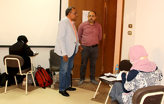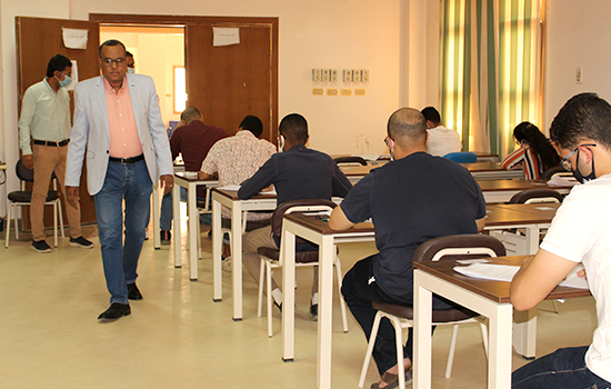 Faculty of medicine’s vice dean of education and student affairs Prof. Moustafa Adam Al Tery inspected the 5th batch’s first-round examination halls (internal medicine course – 3rd paper, dermatology and venereology course as well as clinical pathology course). He also inspected the 2nd batch’s 2nd round examination halls for the academic year 2020/2021 to ensure applying all the precautionary measures against COVID-19 announced previously by the World Health Organization WHO and the ministries of health and higher education. He was accompanied by Dr. Souod Mohammed Al Sagheir, head of examination halls and lecturer of cardiovascular medicine. The faculty administration distributed face masks on students and disinfected them before entering examination halls.