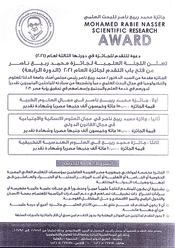 Based on the received letter from the President of Delta University for Science and Technology, regarding announcing the fourth edition of ”Mohamed Rabie Nasser” Award -Chairman of Board of Trustees of Delta University for Science and Technology that aims to encourage the prominent researchers in presenting creative solutions to solve society’s problems and advance it, as well as supporting the progress for the outputs of a research system that reflects on the service and entertainment of citizens.