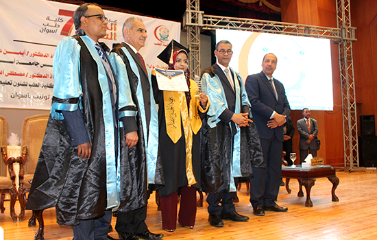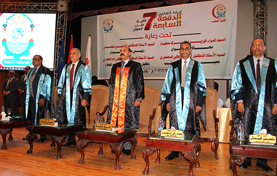 Prof. Al-Dahshoury explained that the graduation ceremony is a tradition that takes place every year, adding that these graduates were assigned to work as resident and intern doctors in Aswan university hospital, in various medical specialties such as surgery, gynecology, obstetrics, orthopedics, dentistry, and other, which they chose with complete transparency based on their desires according to the total scores of each of them. Some of them will work in the academic departments of the faculty of medicine. His Excellency indicated that the first academic year in the faculty began in 2013/2014 after the issuance of the Republican Decree No. (200) of (2013).