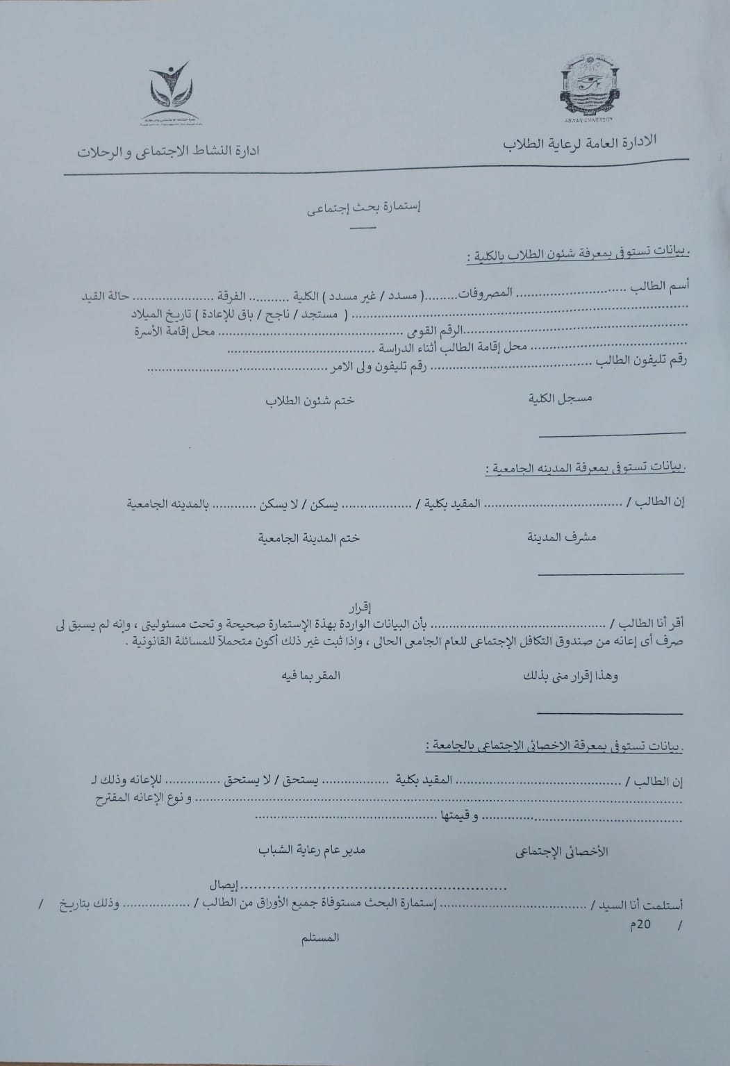 The University’s Social Activities and Trips Department announces the opening of the “Social Solidarity” door for university students beginning Thursday, October 10, 2024, and ending November 15, 2024.