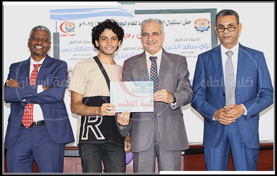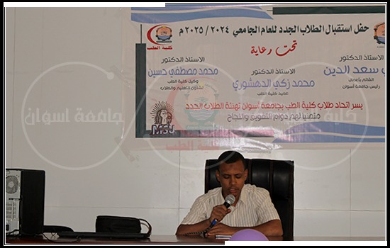Under the patronage of Prof. Louay Sa’sd Al-Din Nassrat, Acting Aswan University President, it’s held on Monday, corresponding to the 7th October reception of new and old students for the academic year 2024/2025 with the honor and presence of His Excellency and the attendance of Prof. Mohamed Zaki Al-Dahshoury, Dean of the Faculty of Medicine, and Prof. Mohamed Mostafa Hussein Younis, Vice Dean for Education and Student Affairs, Prof. Mustafa Adam Al-Tayri, Vice Dean for Postgraduate Studies and Research, Prof. Ashraf Maabad, Vice Dean for Community Service and Environmental Development, and Prof. Magda Farghali Gebry, Director of the Education Development Program at the faculty.