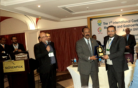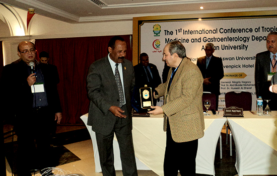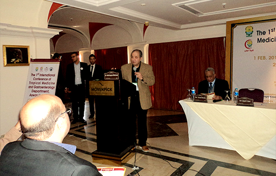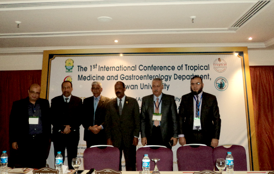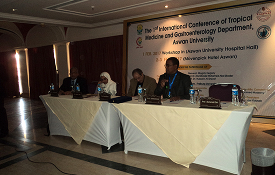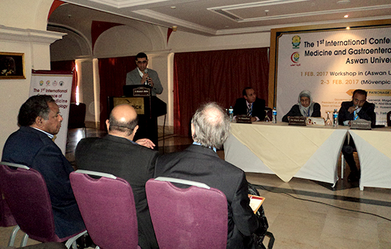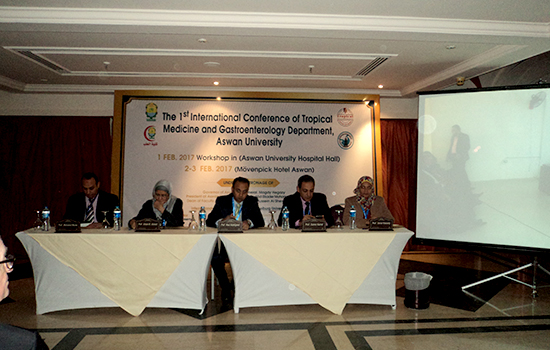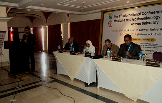The first international scientific conference of the Department of Tropical Medicine and Gastroenterology kicked off today corresponding to 2nd Feb. 2017 at Movenpick Hotel, under the supervision of Prof Ihab Fawzi Abdo, the department supervisor and the conference chairman, in the presence of Prof. Abdel Qader Mohamed Abdel Qader, acting president of Aswan university, Prof. Mansour Muhammad Kabbash, honorary president of the conference, Prof. Hussein Al Sharif, dean of the faculty of medicine, Mr. Abdel Nasser Mohamed, Aswan governorate secretary general, on behalf of Maj. Gen. Magdi Hegazy, Aswan governor, as well as Prof. Hubert Blume, professor at the university of Freiburg. The conference introduced many scientific sessions in the presence of a large group of professors from Egyptian universities, which numbered 9 in addition to the National Liver Institute, the Institute of Oncology Research in Cairo, the University of Freiburg, Germany, as well as doctors from Aswan and other different governorates.