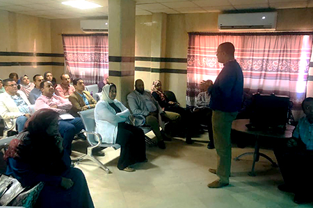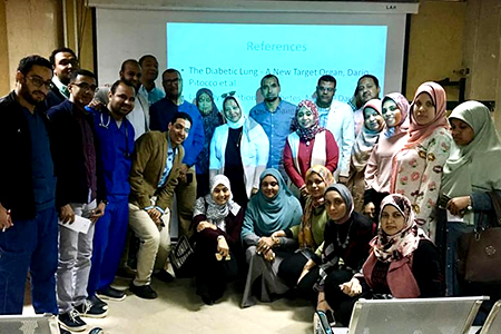 Under the patronage of the dean f the faculty of medicine Prof. Mohamed Zaki Al-Dahshoury and Aswan university hospitals’ director-general Prof. Dr. Abdullah Al-Obaidi and the supervision of the chairman of the department of general internal medicine Dr. Hala Al-Obaidi and the chairman of chest department diseases Dr. Shazly Baghdadi, the weekly scientific session of the general internal medicine department in cooperation with the chest diseases department was held on Tuesday corresponding to 3rd Dec. 2019 in the Internal Medicine Hall at Aswan University Hospital headquarters. This session is part of lecture series on diabetes. The session was lectured by Dr. Amr Abu Al Hassan, assistant lecturer in the chest diseases department; he handled diabetes symptoms and its effect on the breath “lung is targeted in diabetics patients”.