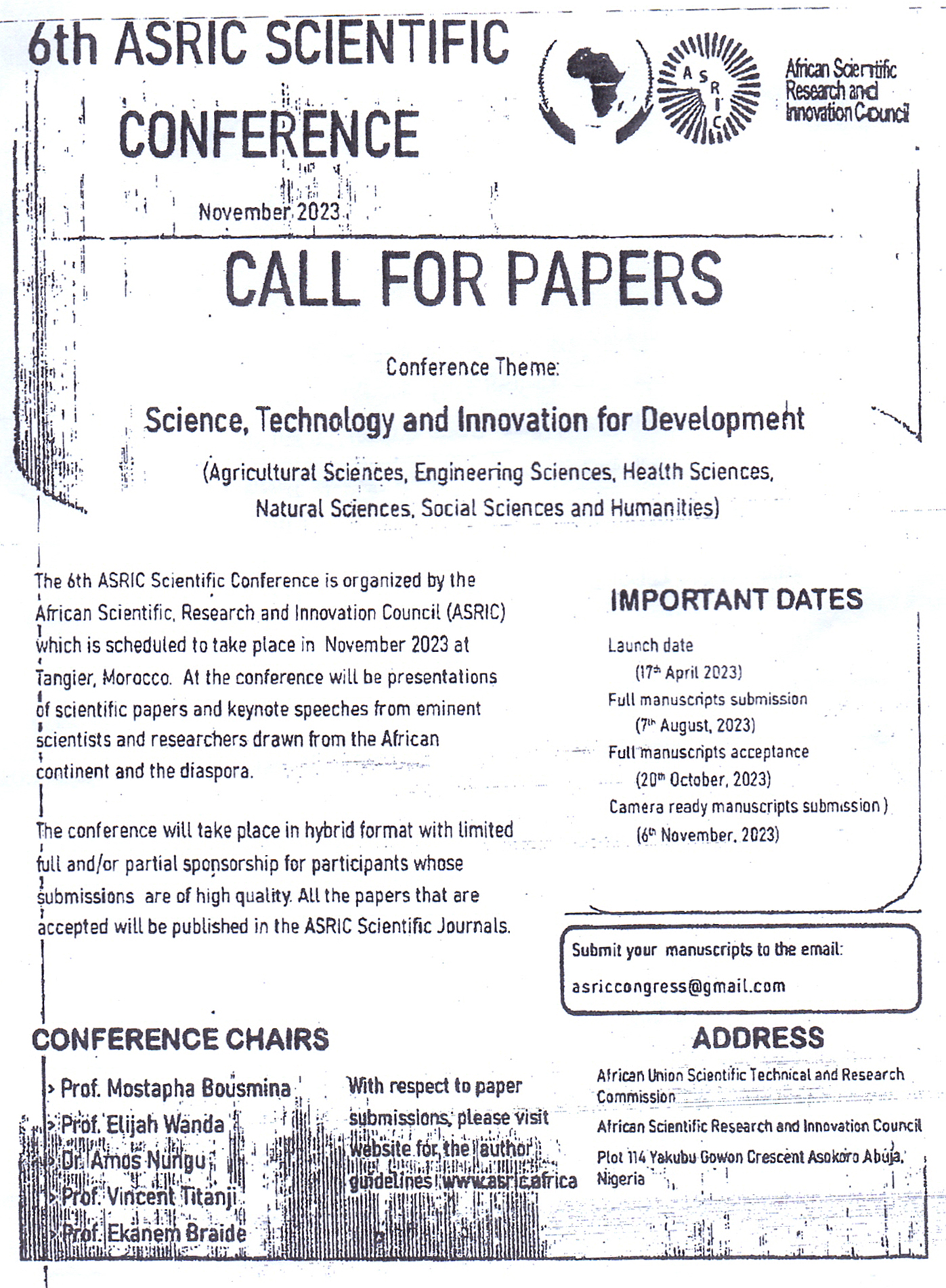 الذى تنظمه مفوضية الإتحاد الأفريقى التنفيذية للبحث العلمى والتقنى (AU-ASRIC) بالتعاون مع اللجنة الأفريقية للبحث العلمى والإبتكار (ASRIC)، والمقرر عقده فى نوفمبر 2023 بمدينة طنجة بالمغرب، بحيث يهدف المؤتمر إلى عرض الأبحاث العلمية للطلاب والباحثين من القارة.