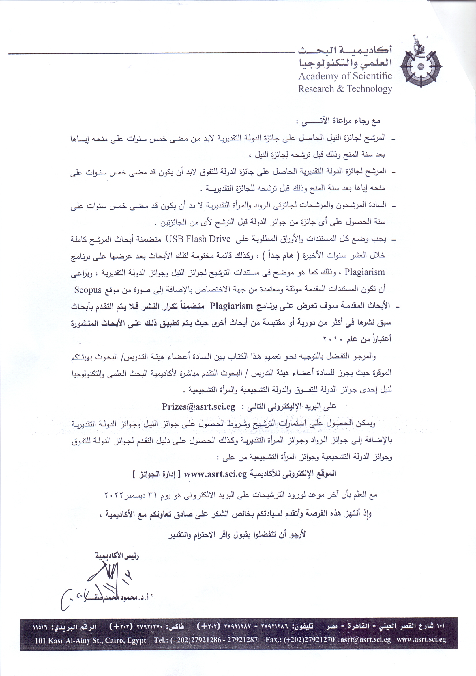 إعلان أكاديمية البحث العلمى والتكنولوجيا عن فتح باب الترشيح والتقدم لجوائز الدولة