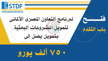 يعلن المجلس الأعلى للجامعات (الإدارة العامة للعلاقات الثقافية – إدارة المنظمات الدولية والمؤتمرات)، أنه بالإشارة إلى ما ورد لأمانة المجلس من السيد أ.د./ الرئيس التنفيذى لهيئة تمويل العلوم والتكنولوجيا والإبتكار والمتضمن بأن هيئة تمويل العلوم والتكنولوجيا والإبتكار قد أعلنت عن فتح باب التقدم لبرنامج التعاون المصرى الألمانى (GERF) لتمويل المشروعات البحثية المشتركة بتمويل يصل إلى 750 ألف يورو للجانب المصرى.