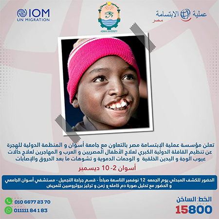 تعلن مؤسسة عملية الإبتسامة مصر بالتعاون مع جامعة أسوان والمنظمة الدولية للهجرة عن تنظيم «القافلة الدولية الكبرى» لعلاج الأطفال المصريين والعرب والمهاجرين، خلال الفترة من 2 : 10 ديسمبر 2021، وذلك لعلاج حالات: