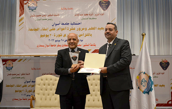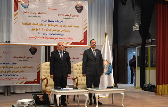 إحتفلت جامعة أسوان اليوم الثلاثاء الموافق 28 يونيو 2022، برئاسة وبحضور الأستاذ الدكتور/ أيمن محمود عثمان – رئيس جامعة أسوان، بمناسبة عيد العلم ومرور عشرة أعوام علي إنشائها وتزامناً مع إحتفالات الشعب المصرى بذكرى ثورة 30 يونيو المجيدة.