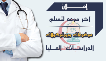 تعلن إدارة الدراسات العليا بكلية الطب، برئاسة الأستاذ الدكتور/ محمد مصطفى حسين – وكيل الكلية لشئون الدراسات العليا والبحوث، أنه تقرر إنعقاد لجنتى (الدراسات العليا والبحوث – أخلاقيات البحث العلمى) يوم الثلاثاء الموافق 1 نوفمبر 2022، فى تمام الساعة العاشرة صباحاً بمكتب العميد بمقر مستشفى أسوان الجامعى، وأن آخر موعد لطلاب الدراسات العليا (ماجستير – دكتوراه):