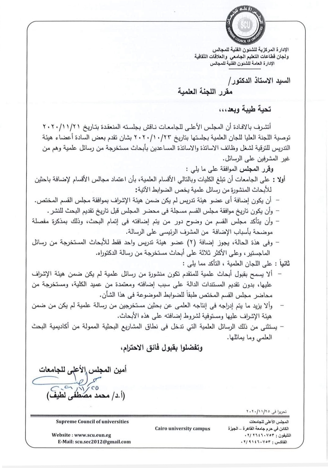 أولاً: على الجامعات أن تبلغ الكليات وبالتالى الأقسام العلمية بأن إعتماد مجالس الأقسام لإضافه باحثين للأبحاث المنشورة من رسائل علمية يخص الضوابط الآتية: