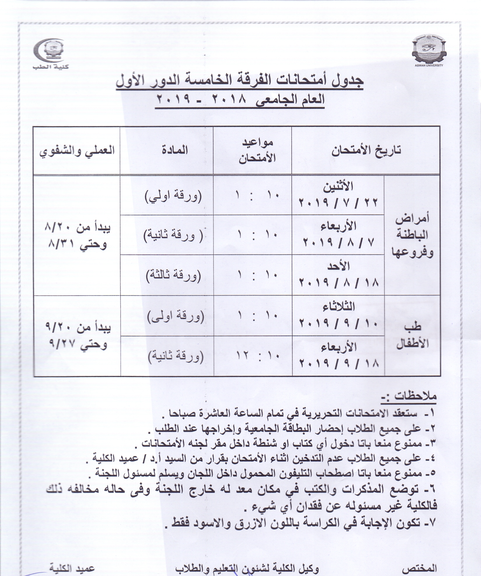 إعتمد السيد الأستاذ الدكتور/ محمد زكى الدهشورى – عميد الكلية، والسيد الأستاذ الدكتور/ مصطفى الطيرى – وكيل الكلية لشئون التعليم والطلاب، جدول إمتحانات الفرقة الخامسة الدور الأول للعام الجامعى 2019/2018، متمنيين لهم دوام التفوق والنجاح، فعلى الطلاب والطالبات الضغط هنــــــا للحصول على الجدول.