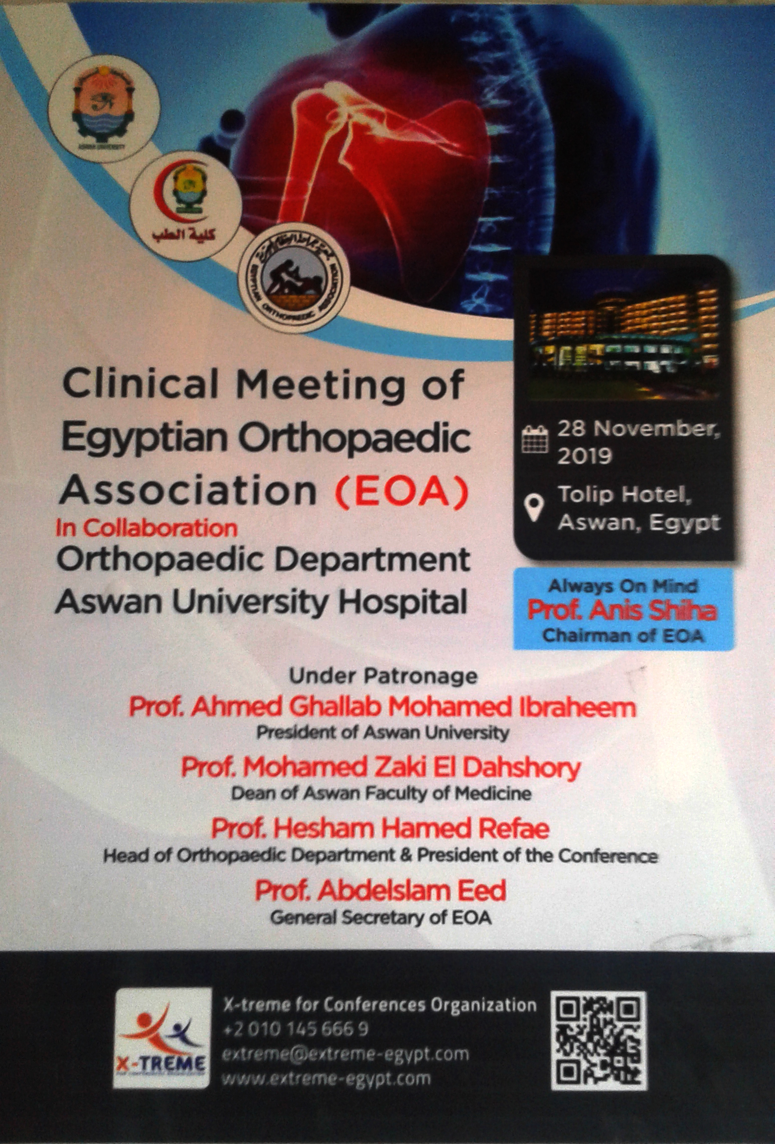 والذى تنظمه جمعية جراحة العظام المصرية بالتعاون مع قسم العظام بمستشفى أسوان الجامعى، على أن يعقد يوم الخميس الموافق 28 نوفمبر 2019، بفندق توليب (هيلنان سابقاً).