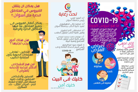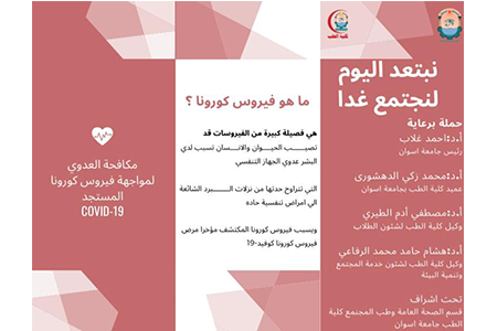 تحت رعاية السيد الأستاذ الدكتور/ أحمد غلاب محمد – رئيس الجامعة، والأستاذ الدكتور/ محمد زكى الدهشورى – عميد كلية الطب، تحت إشراف الأستاذ الدكتور/ مصطفى آدم الطيرى – وكيل الكلية لشئون التعليم والطلاب، والأستاذ الدكتور/ هشام حامد الرفاعى – وكيل الكلية لشئون خدمة المجتمع وتنمية البيئة، والدكتورة/ شيماء سيد عبد الرحيم – مدرس الصحة العامة وطب المجتمع، قام قسم الصحة العامة وطب المجتمع بكلية الطب جامعة أسوان، بإطلاق حملة أونلاين للتوعية ضد فيروس كورونا المستجد (Covid-19).