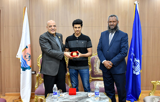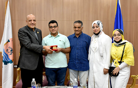 وذلك لحصولهم على المركزين الثالث والرابع فى القائمة النهائية لأوائل الثانوية العامة على مستوى الجمهورية (شعبة علمى رياضة)، متمنياً لهم ولجميع طلاب الثانوية العامة الناجحين دوام التوفيق والنجاح، كما قام سيادته بتقديم درع الجامعة لهم وحثهم علي التفوق وتحقيق المراكز الأولي العملية.