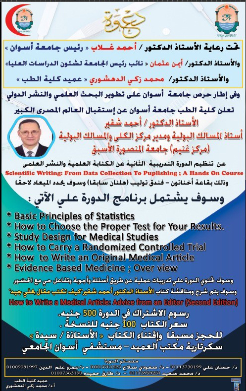 تحت رعاية السيد الأستاذ الدكتور/ أحمد غلاب – رئيس الجامعة، والأستاذ الدكتور/ أيمن عثمان – نائب رئيس الجامعة لشئون الدراسات العليا، والأستاذ الدكتور/ محمد زكى الدهشورى – عميد كلية الطب، وفى إطار حرص جامعة أسوان على تطوير البحث العلمى والنشر الدولى، تعلن كلية الطب جامعة أسوان عن إستقبال العالم المصرى الكبير الأستاذ الدكتور/ أحمد شقير – أستاذ المسالك البولية ومدير مركز الكلى والمسالك البولية ( مركز غنيم ) جامعة المنصور الأسبق، عن تنظيم الدورة التدريبية الثانية عن الكتابة العلمية والنشر العلمى: