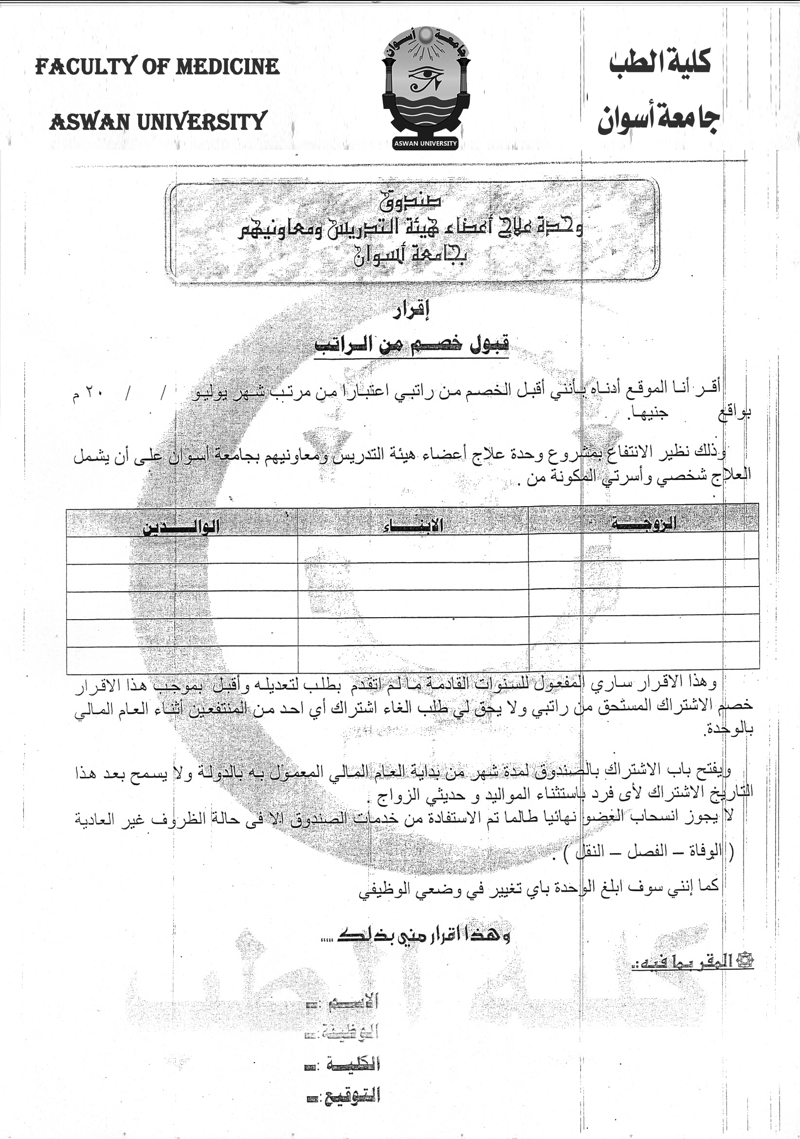 - على السادة أعضاء هيئة التدريس ومعاونيهم ضرورة طباعة وملئ الإقرار التالى وتسليمه لمقر الوحدة العلاجية بالكلية إقــــــــرار