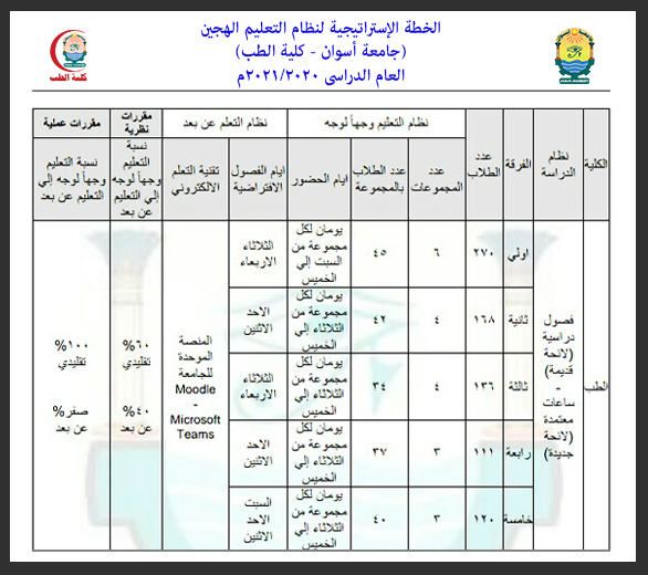 تعلن جامعة أسوان برئاسة الأستاذ الدكتور/ أحمد غلاب محمد – رئيس الجامعة، عن جداول خطة الجامعة الإستراتيجية فى التعليم الهجين للعام الدارسى 2021/2020 م بمختلف الكليات، بحيث يكون جدول كلية الطب كالتالى: