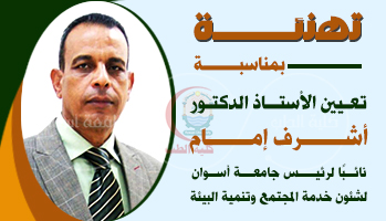 يتقدم الأستاذ الدكتور/ محمد زكى الدهشورى – عميد كلية الطب والسادة وكلاء الكلية وأعضاء هيئة التدريس ومعاونيهم وجميع العاملين بالكلية، ومجلس إدارة مستشفيات جامعة أسوان وعلى رأسهم الأستاذ الدكتور/ محمد صلاح الدين – المدير التنفيذى لمستشفيات أسوان الجامعية، والأستاذ الدكتور/ رمضان غالب – مدير مستشفة الباطنة التخصصى الجديد ،والأستاذ الدكتور/ محمد ربيع – مدير مستشفى الجراحة، وجميع العاملين بها، بالتهنئة للسيد الأستاذ الدكتور/ أشرف أمام عبد الرضى طايع – عميد كلية العلوم، بمناسبة صدور القرار الجمهوري بتعيين سيادته نائبًا لرئيس الجامعة لشئون خدمة المجتمع وتنمية البيئة، متمنين لسيادته دوام التوفيق والتقدم والإزدهار وأن يكلل له النجاح في مهام منصبه الجديد.